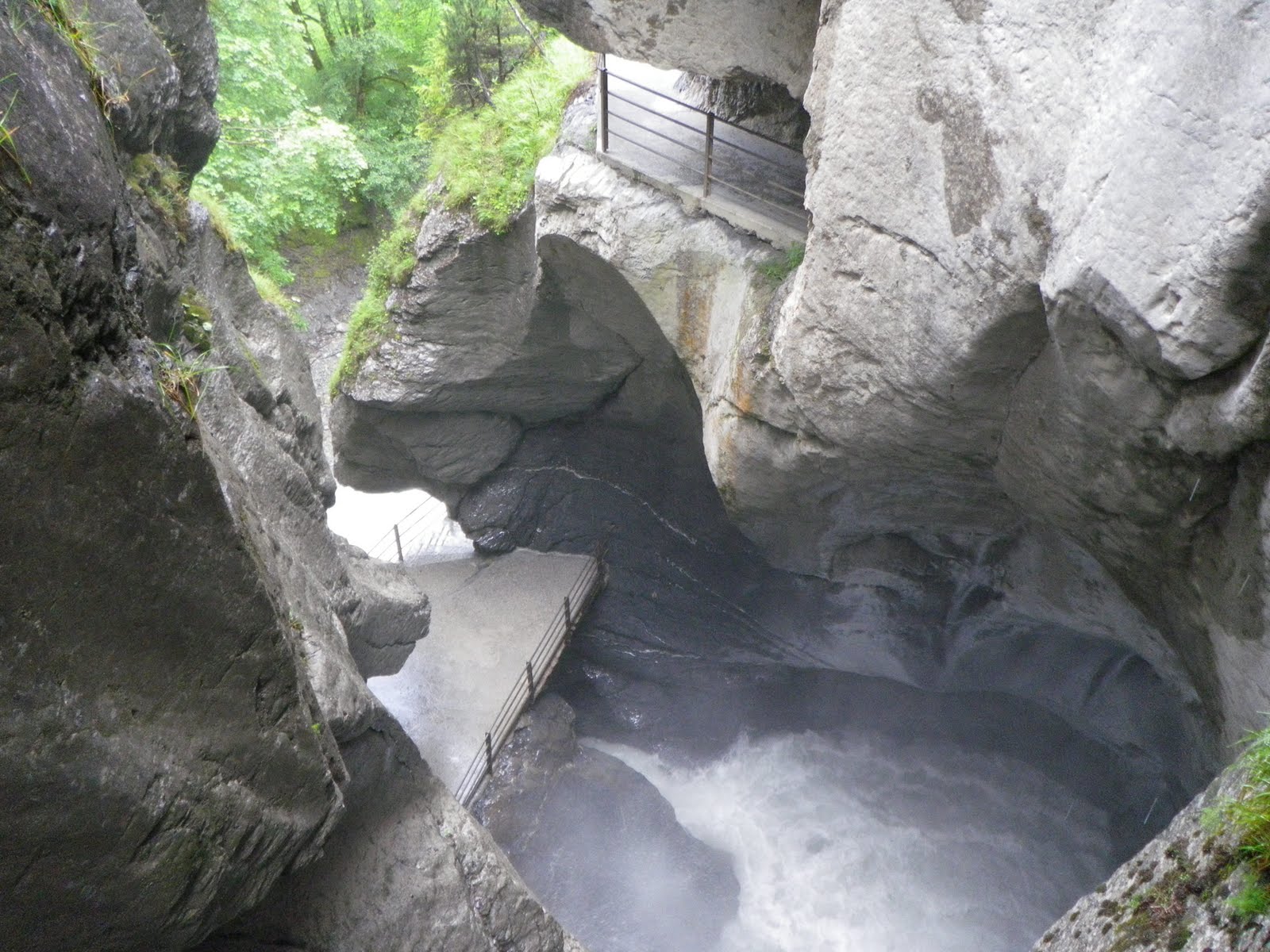 After arriving in Gridewald we hiked for an hour or so along one of the many rivers in the area. It was nice and relaxing after our previous days adventure. Eventually we arrived at the Gletscherschlucht, which means Glacier Gorge. It lies beneath the Grindewald Glacier, and the lake that it's run off forms. Years of glacier run off have carved an amazing gorge. For $7 admission you can walk for well over a km into the gorge. In places you are on platforms which are bolted to the sides of the gorge, in other places you walk through man made tunnels. Along the way you can see pink and green marble in the rock walls. There is a quarry nearby. There is also some great information about a huge tunnel which was made several years ago leading up inside the mountain to the glacial lake...it's a sort of pressure relief valve to prevent the lake from overflowing into the valley below, an affect of global warming.